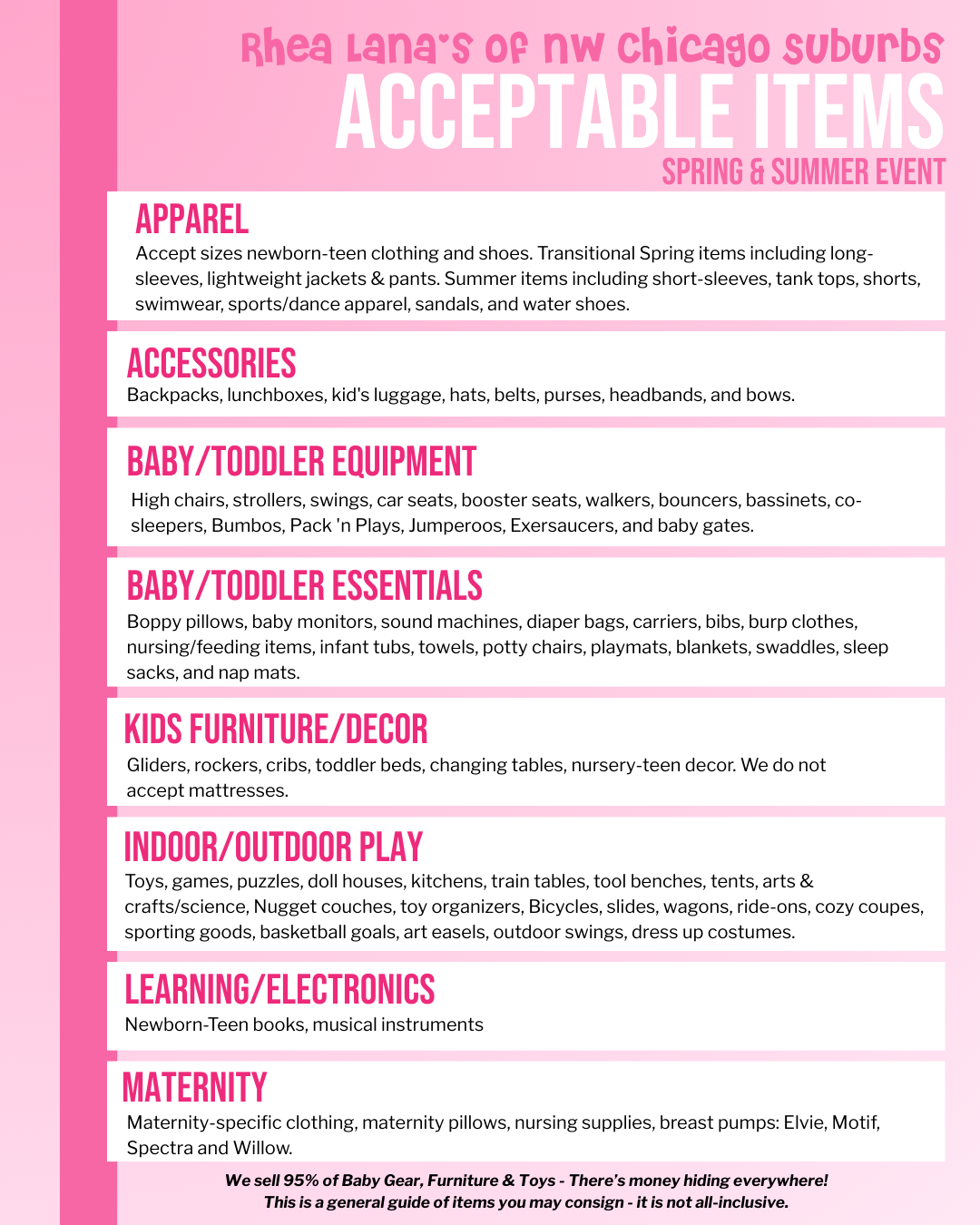 Recalled items, items missing straps, owlet monitors, DVDs or VHS, or mattresses, the only stuffed animals we can accept are Jellycat, Squishmallow, Build-a-bear, talking/animated, and Licensed Disney. 0-12 months clothes are restricted to 25 items per gender, per consignor ID. Juniors girls clothes are restricted to 25 hanging items per Consignor ID.